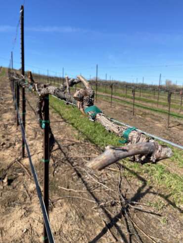 Vineyards are in a constant cycle with no true beginning and end, but we have to start somewhere, so let’s start at pruning in February, where each vine’s canes (those long stems) are cut back to only 2 small buds. It reminds me of my mother’s poodle after he had been to the groomer – all trimmed up and nearly bald. The vineyard similarly looks bare, but come March, the buds swell and green shoots appear (bud-break) and off we go on another glorious California grape growing season.